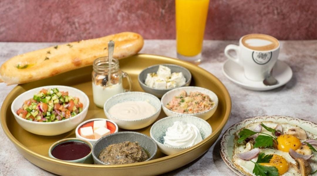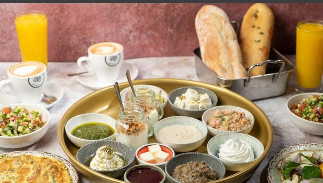 بيض من اختيارك، سلطة مقطعة شخصية / أوراق، خبز من اختيارك: فوكاشيا / خبز الحبوب / خبز أبيض مصحوب بمجموعة من التغميسات: جبنة فيتا بزيت الزيتون والزعتر، جبنة كريمية، سلطة تونة بالمايونيز، طحينة، باذنجان قابل للدهن، لبنة مع زيت الزيتون والزعتر، سلطة الأفوكادو، البيستو، المربى محلية الصنع، الزبدة والموزلي الصغير، تقدم مع المشروبات الغازية والساخنة لكل عشاء.يتم تقديم الأطباق في فئة "الصباح" (ما عدا الشكشوكة والمويسلي) مع مشروب من اختيارك المشروبات الساخنة: اسبريسو / ماكياتو / كابتشينو / أمريكانو / قهوة نيس على الحليب / قهوة سوداء / شوكولاتة / شاي / قهوة باردة. المشروبات الغازية: البرتقال / عصير الليمون / الجزر / الجزر / الجريب فروت الأحمر / الصودا / المياه المعدنية.زيادة المشروب برسوم إضافية | مشروب غازي في زجاجة مقابل رسوم إضافية | القهوة المثلجة / عصير الليمون المطحون مقابل تكلفة إضافية.