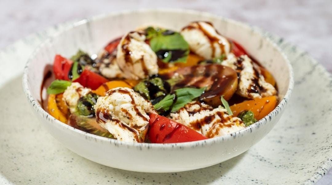 طماطم كرزية ملونة، جبنة موزاريلا مبروشه، أوراق ريحان طازجة متبلة بزيت الزيتون، ليمون، بيستو وخل البلسميك.