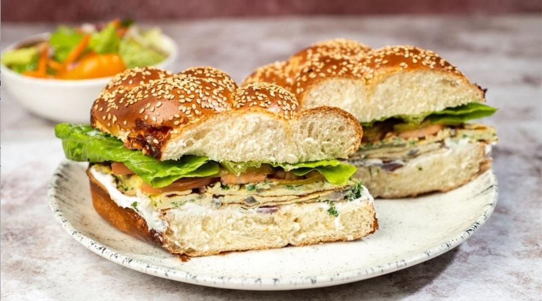 عجة الخضار أومليت خضار مقلية و بصل، جبنة كريمية، خيار مخلل، طماطم وخس.