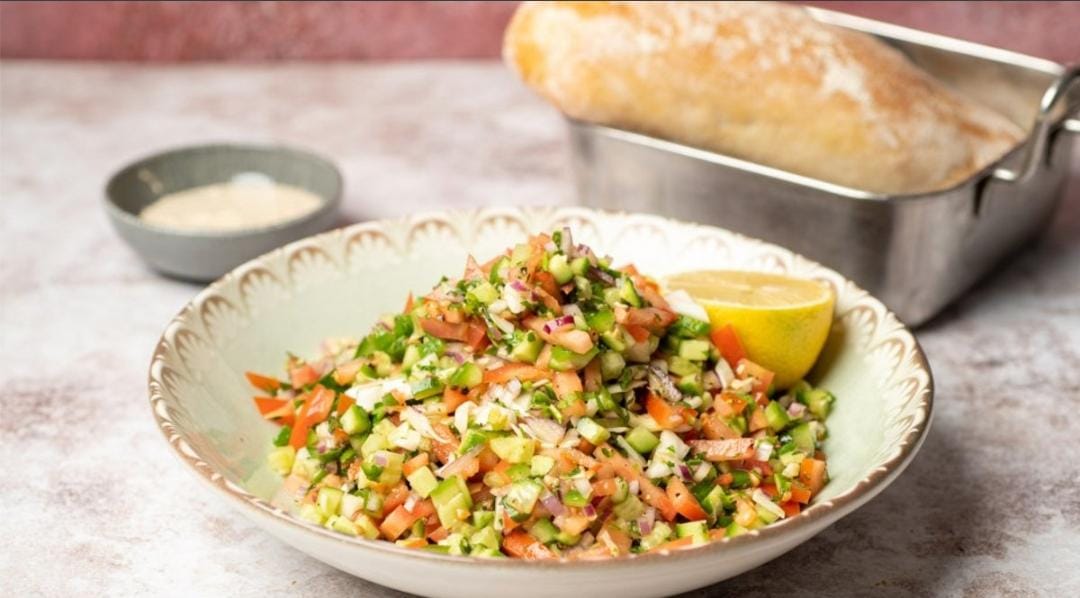 طماطم، خيار، بصل أرجواني، ملفوف أبيض وأعشاب.متبل بزيت الزيتون وعصير الليمون والطحينة على الجانبسلطاتنا تقدم مع الخبز من اختياركيمكن ترقية الخبز إلى focaccia مقابل رسوم إضافية.