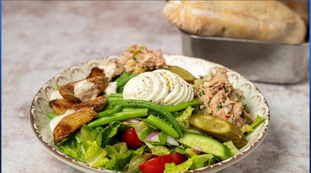 سلطة التونة بالمايونيز، بيض مسلوق، بطاطا مقرمشة وسيزر أيولي، خيار مخلل، فاصوليا خضراء، بصل أرجواني، طماطم كرزية وخيار طازج على طبقة من الخس المتبل بصلصة الخل الخاصة بنا.سلطاتنا تقدم مع الخبز من اختياركيمكن ترقية الخبز إلى focaccia مقابل رسوم إضافية.