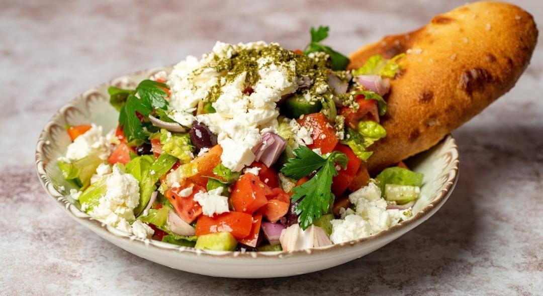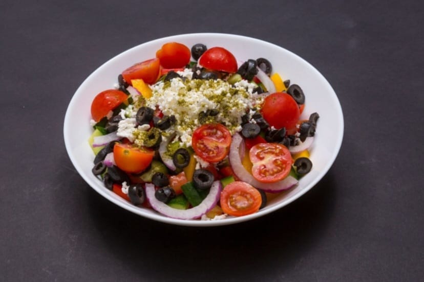 طماطم، خيار، بصل أرجواني، زيتون كالاماتا، فلفل، جزر، أوراق خضراء، في شراب الليمون وزيت الزيتون، الجبن البلغاري والزعتر، يقدم على خبز القدس من الفرن. يقدم بدون خبز إضافي.يمكن ترقية الخبز إلى focaccia مقابل رسوم إضافية.