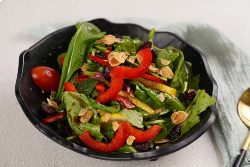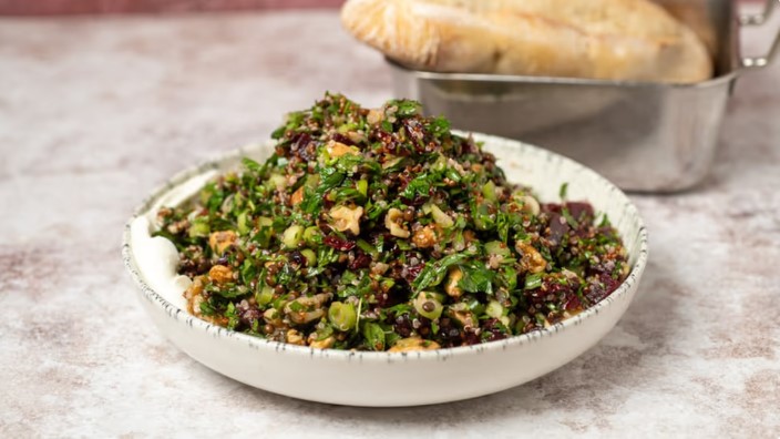 عدس أسود، كينوا، بنجر مقطع، أوراق كرفس، الكثير من البقدونس، بصل أخضر ونعناع مفروم ناعم، توت بري، لوز محمص. متبلة بزيت الزيتون والليمون مع اضافة جبنة لبنة / طحينة.