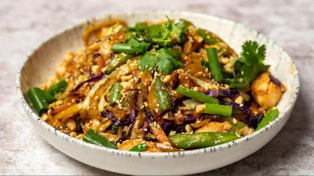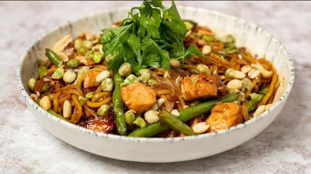 مكعبات حلومي مشوية ومقلية مع أرباع الفطر، جوز في صلصة ترياكي وبيستو، توضع على خليط الخس، طماطم كرزية، خيار، شرائح جزر، بصل أرجواني وأخضر في توابل الخل الخاصة بنا.