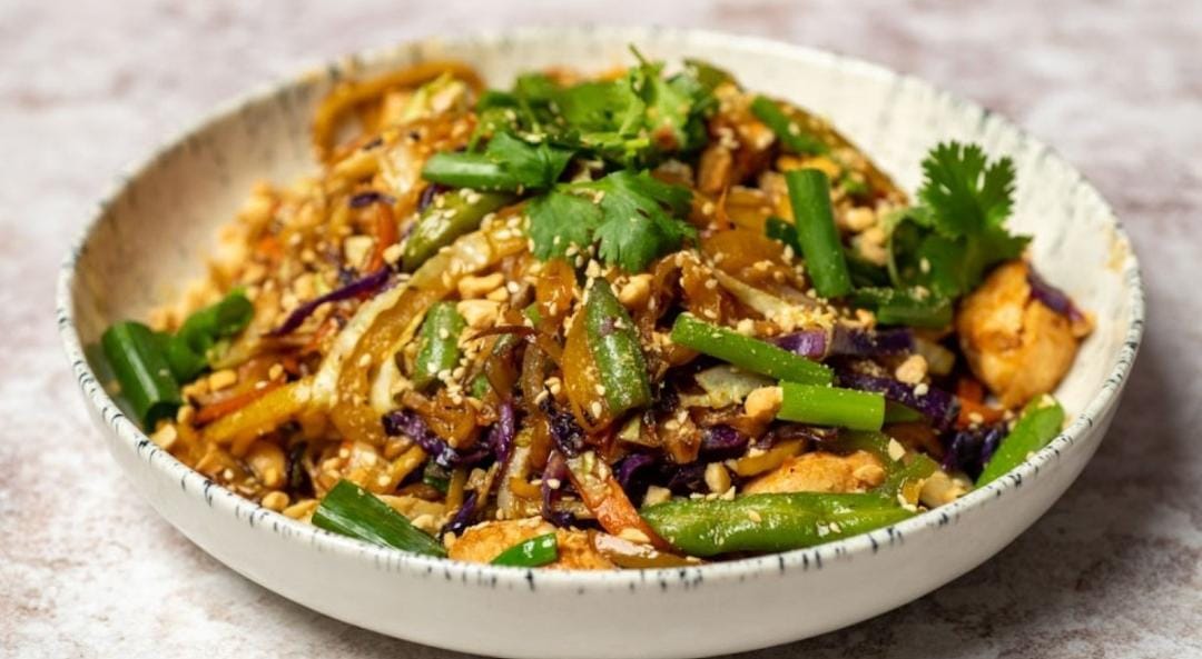 في مقلاة ساخنة مع مكعبات التوفو والأصفر النباتي،