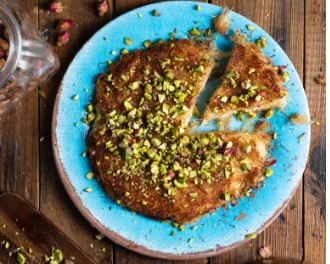 كنافه مع سيروب خاص والفستق المطحون، يقدم مع مغرفة من الآيس كريم.