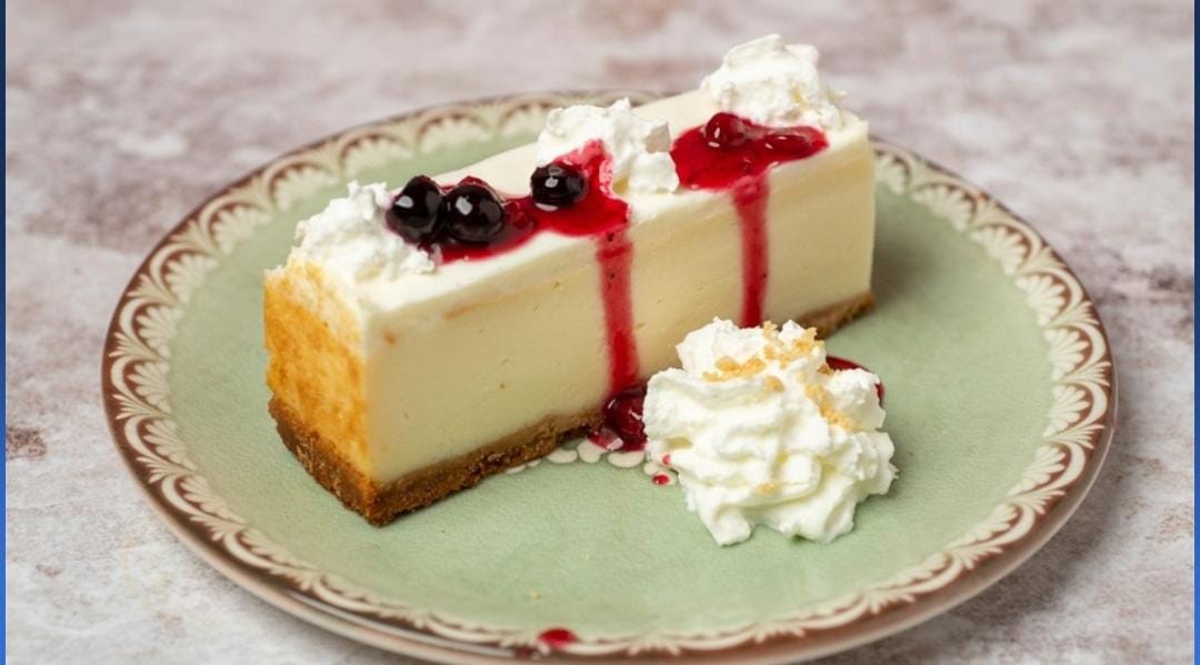 تشيز كيك مخبوزة "نيويورك" بالجبنة، على طبقة من كوكيز الزبدة، كريمة الفانيليا، الكريمة المخفوقة و صوص التوت
