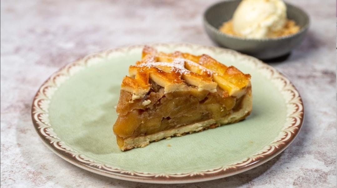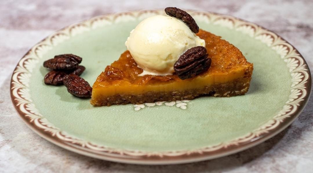 فطيرة مقرمشة وناعمة من الجرانولا والتوفي والكراميل والفانيليا، تقدم مع مغرفة من الآيس كريم وفتات البقان.