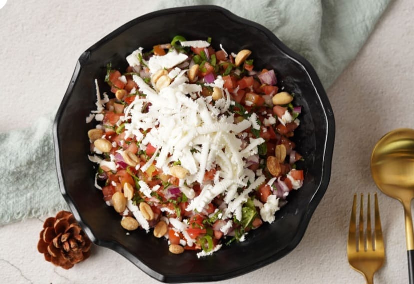 طماطم، خيار، بصل أرجواني، ملفوف أبيض وأعشاب.