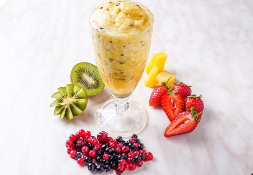 فراولة / موز / مانجو / تمر / شمام / أناناس يعتمد على: الحليب / مشروب الصويا / مشروب الأرز باللوز / الماء / عصير البرتقال. قاعدة الزبادي مقابل تكلفة إضافية.